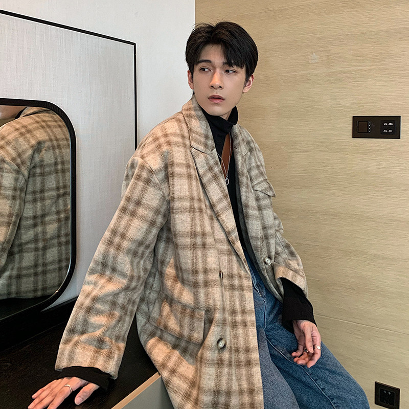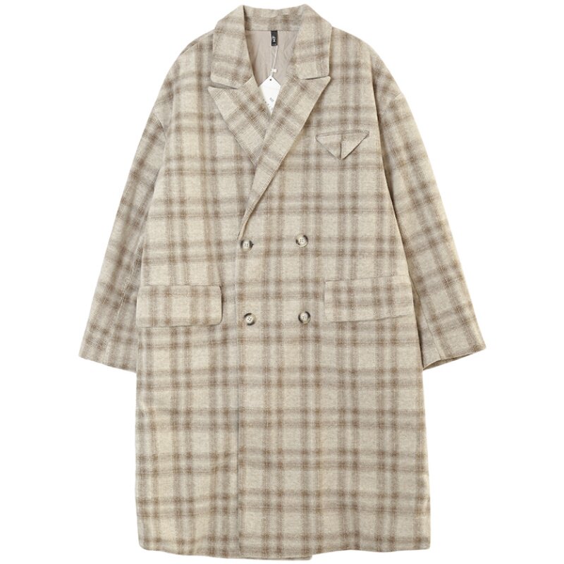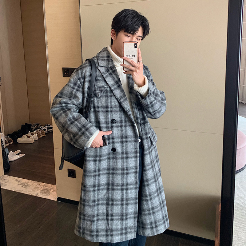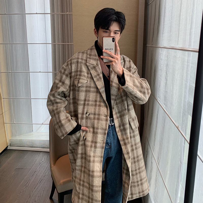 Huanun winter retro plaid long style with kneecap, great coat men's loose jacket autumn and winter thickened handsome