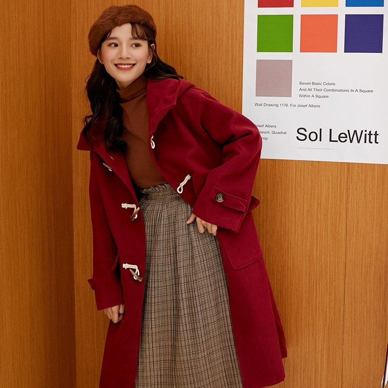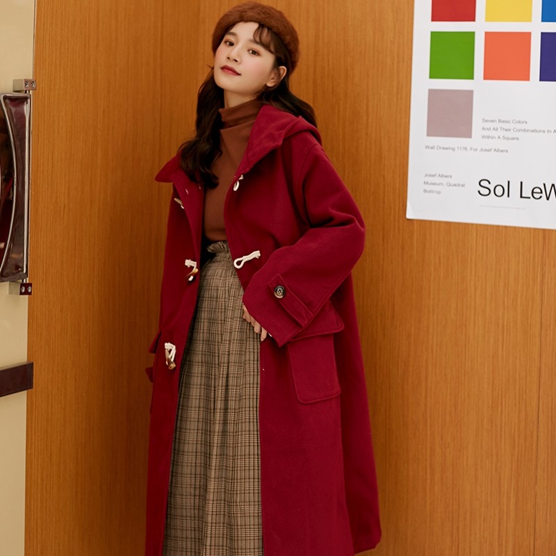Wool coat Women's medium and long version of retro horn buckle hooded coat Small red autumn and winter Korean version of the cape