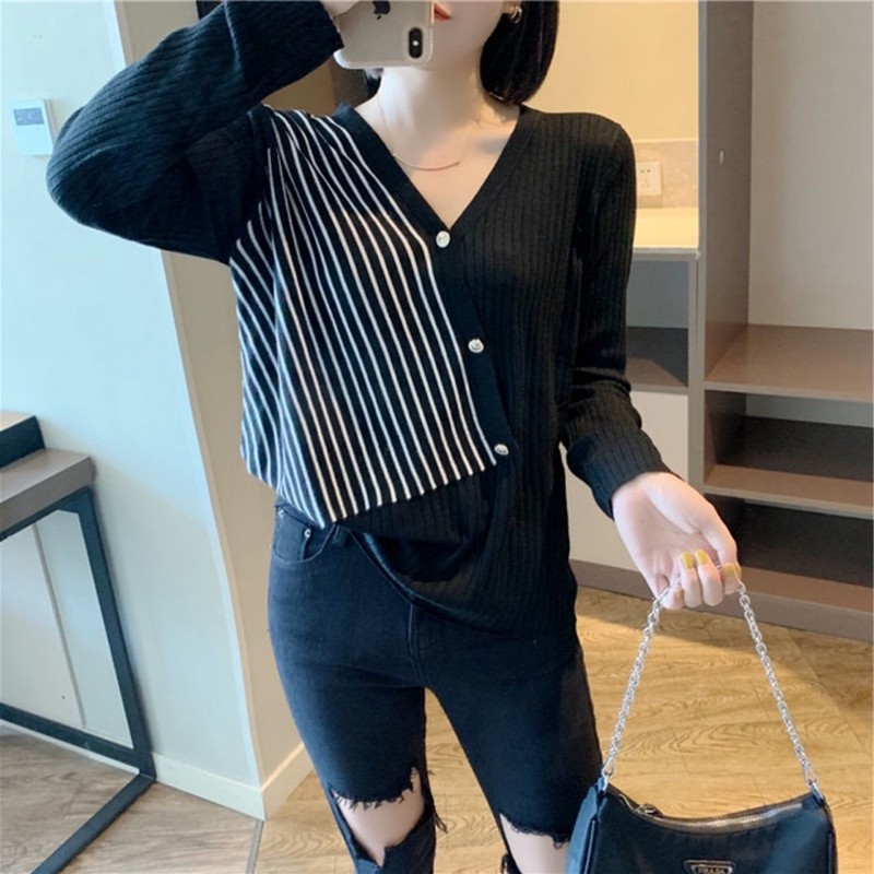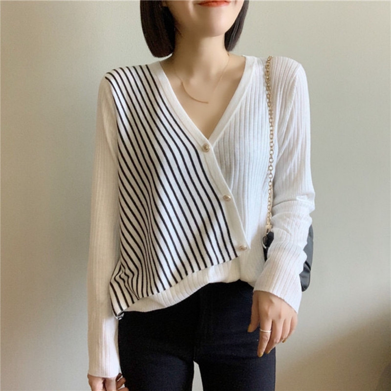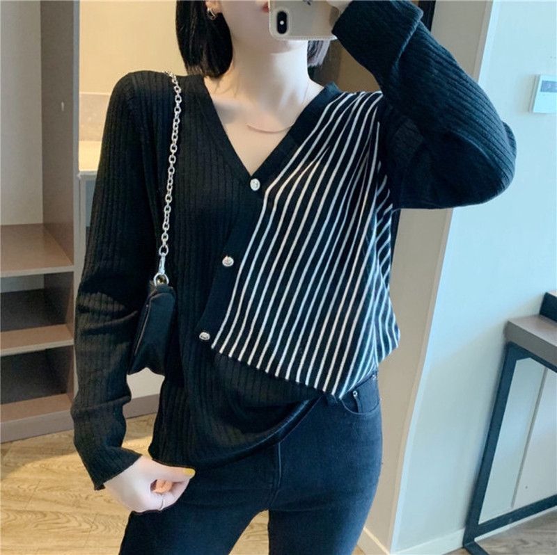 Plus-size women's clothes, fat sisters, belly-covering tops, women's western-style V-neck bottoming sweater, temperament and thin striped sweater