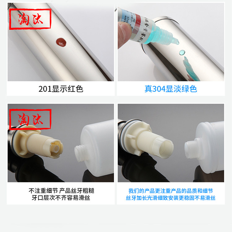 304 stainless steel pressing head + PP plastic bottle body 304 stainless steel pressing head + space aluminum bottle body All copper pressing head + 304 stainless steel bottle body Black 304 stainless steel pressing head + PP plastic bottle body White 304 stainless steel pressing head + PP plastic bottle body