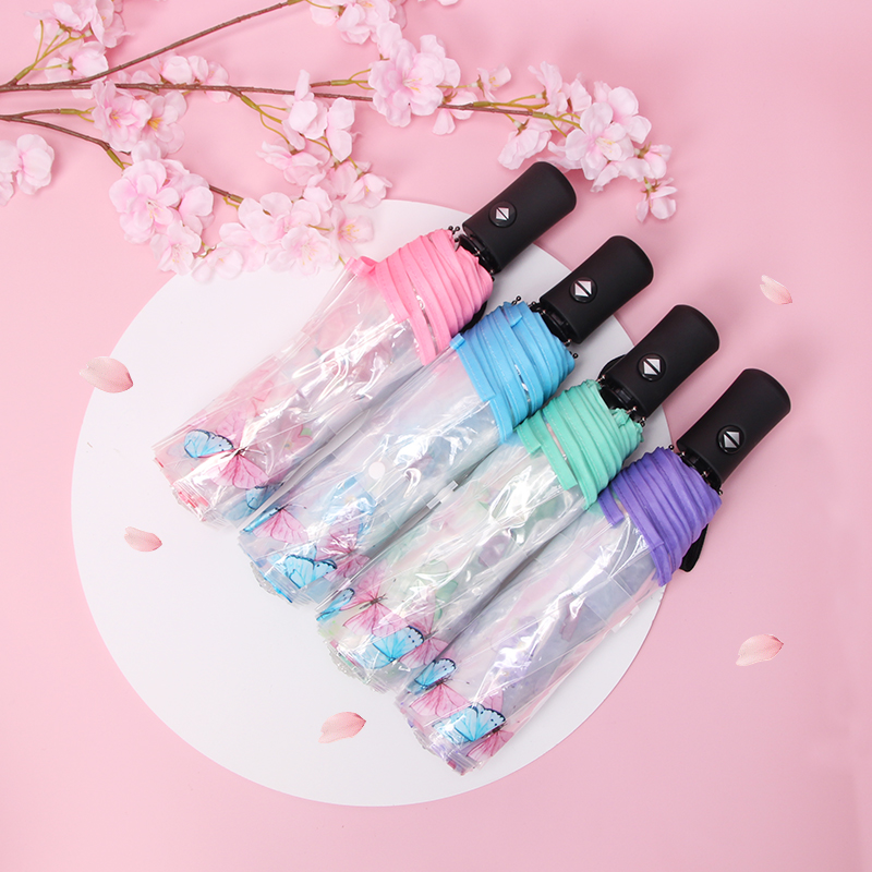 Full automatic self-opening collection of double-use female students with transparent umbrellas, small fresh folding and folding pink young girl's heart umbrella mesh red