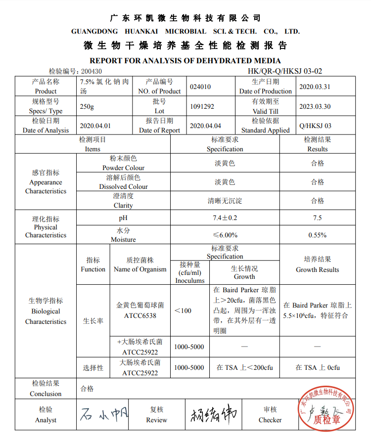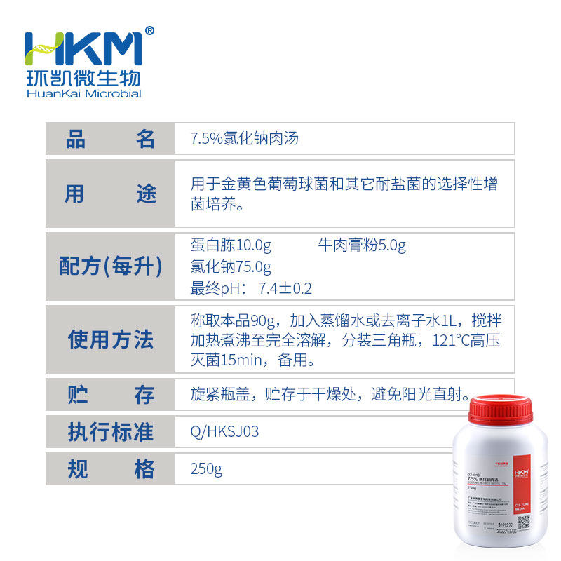 7 5% SODIUM CHLORIDE BROTH 250g SELECTIVE GROWTH AND CULTIVATION OF GUANGDONG RING-KAI DRY POWDER CULTURE MEDIUM 024010