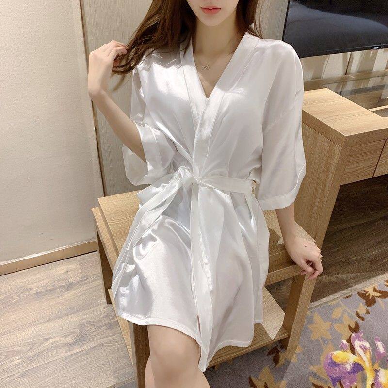 Large size nightgown women's summer ice silk high-end loose kimono net red spring and autumn five-point sleeve bathrobe silk bath dressing gown