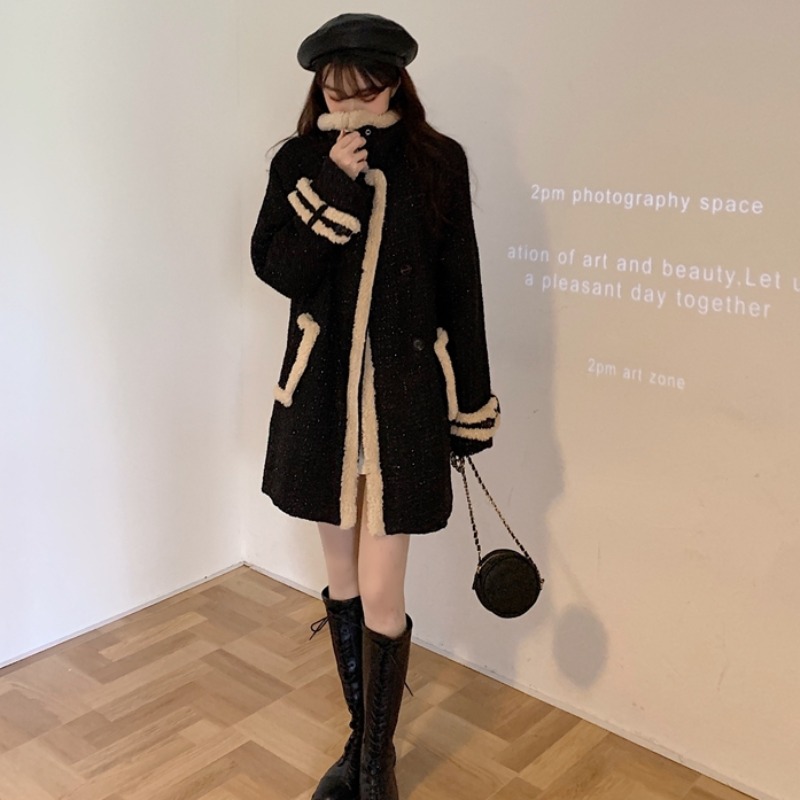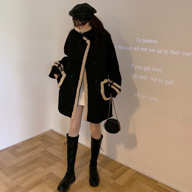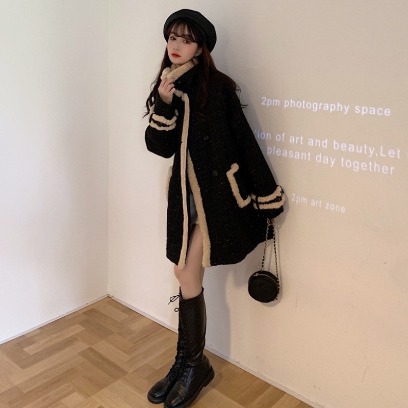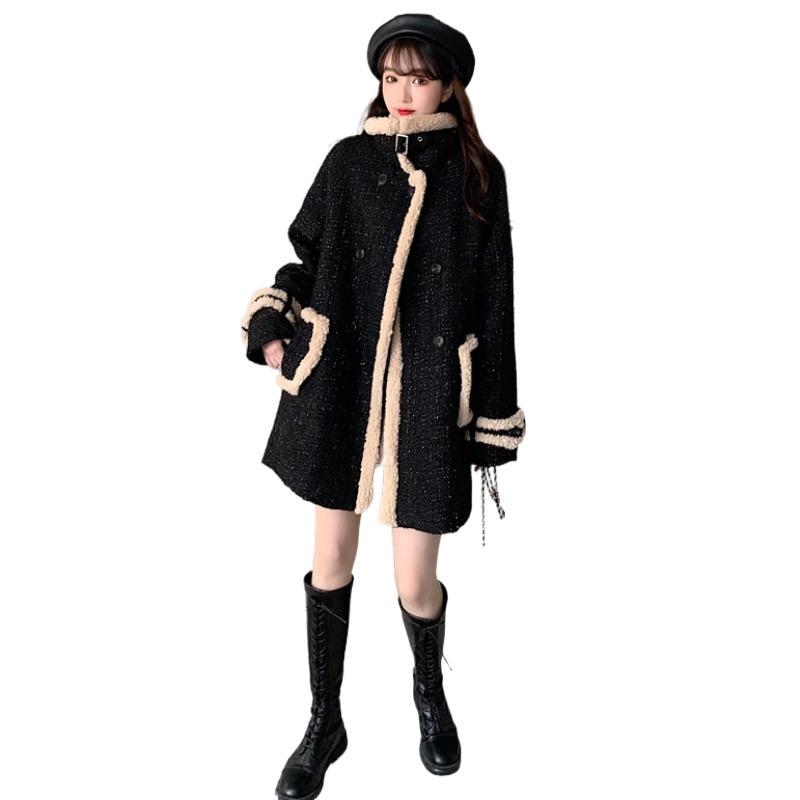 Sanskrit small fragrant wind lamb wool coat female winter medium long version Korean version loose 100 lap up collar gush thickened cotton clothing