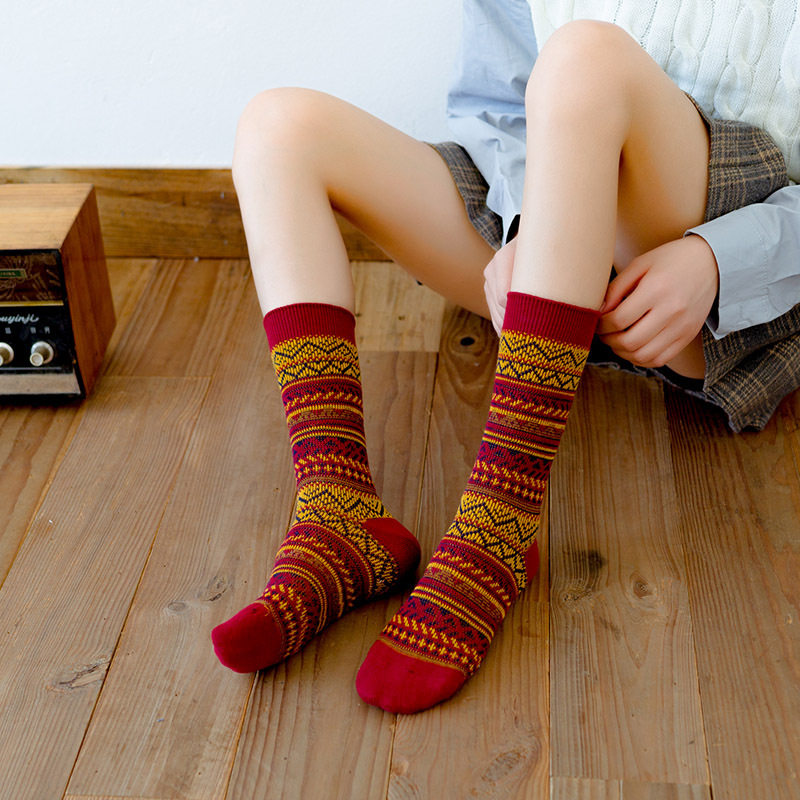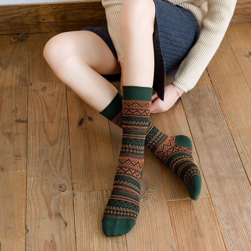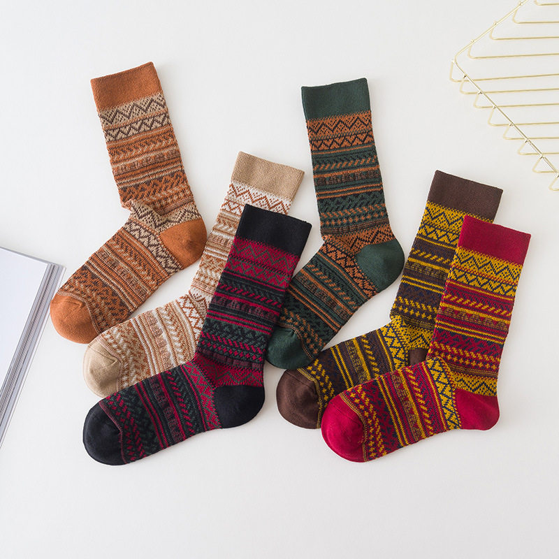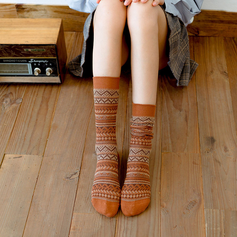 Autumn and winter socks, women's socks, retro ethnic style, double-needle, double-way, ladies' mid-tube socks, cotton socks without thread