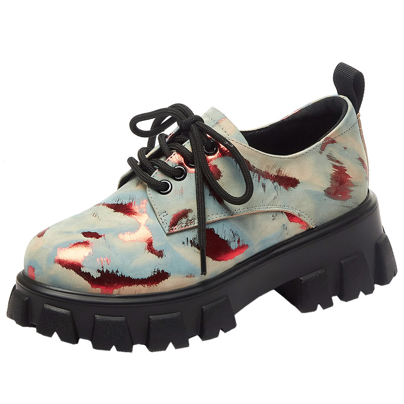 Muffin shoes Women's thick bottom 2022 Spring new genuine leather lacing 100 lap single shoes Inn wind printing high and casual