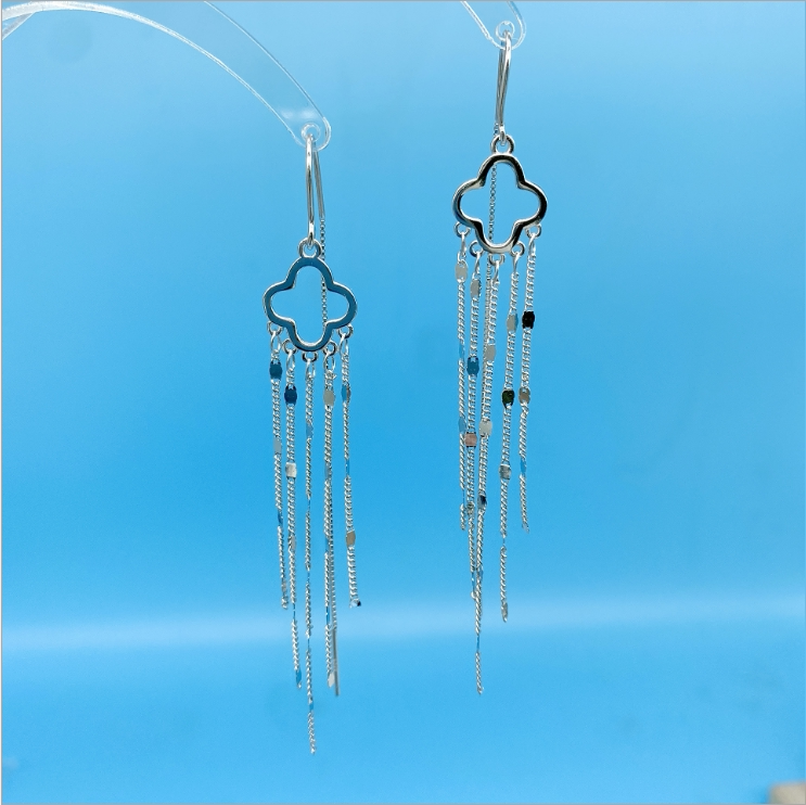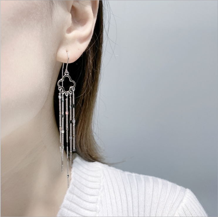 S925 pure silver four-leaf straw bright sheet Japan-ROK Brief 100 lapped anti-loss medium long version Thin Temperament Earrings Earrings