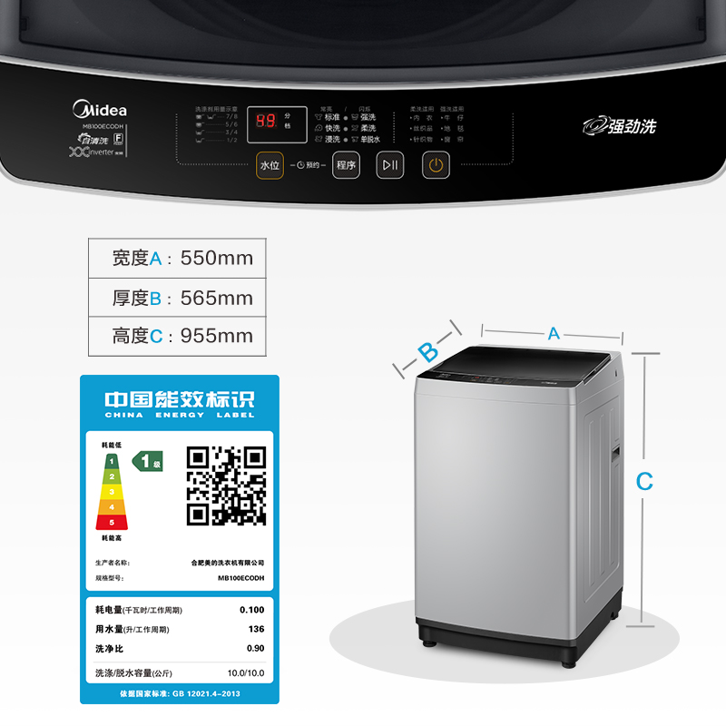 Midea 10KG kg frequency conversion household automatic silent wave wheel washing machine elution integrated MB100ECODH