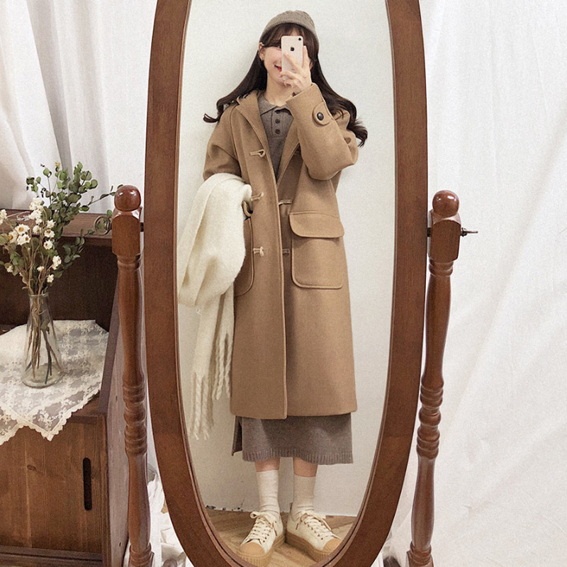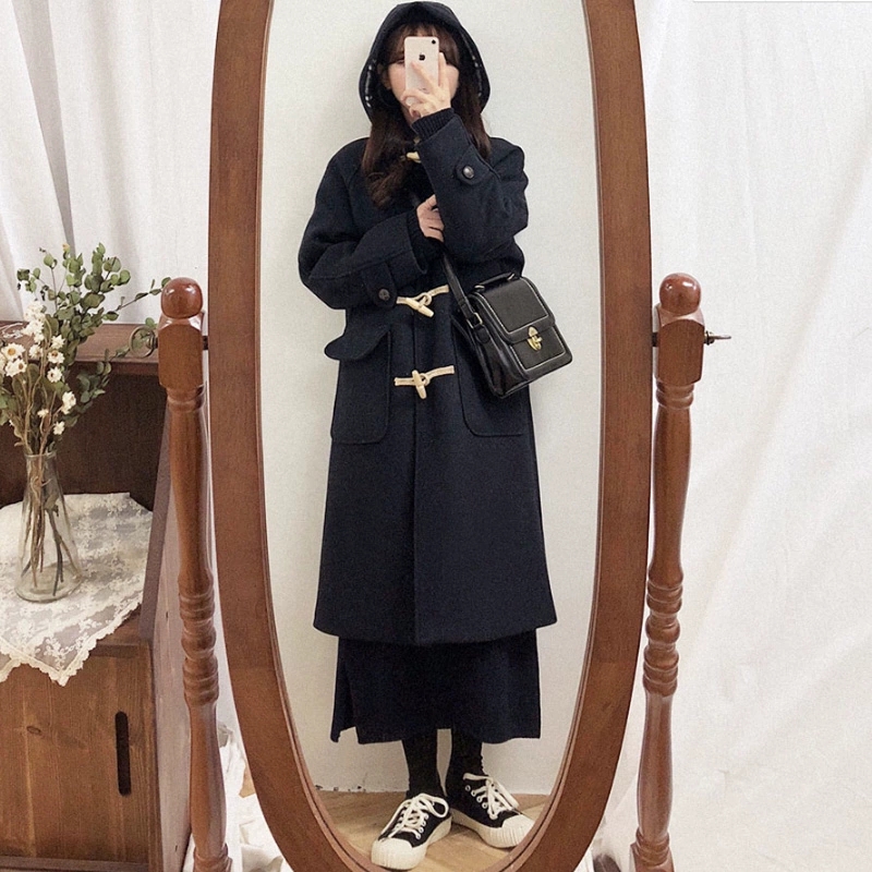 Horns buckle Grand coat female autumn winter clothing 2022 The new one is in the middle of the long version of the small sub-day family Mao's coat spring and autumn