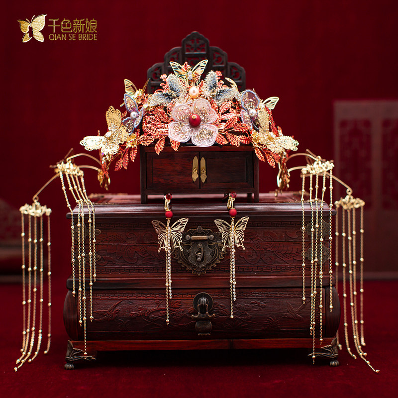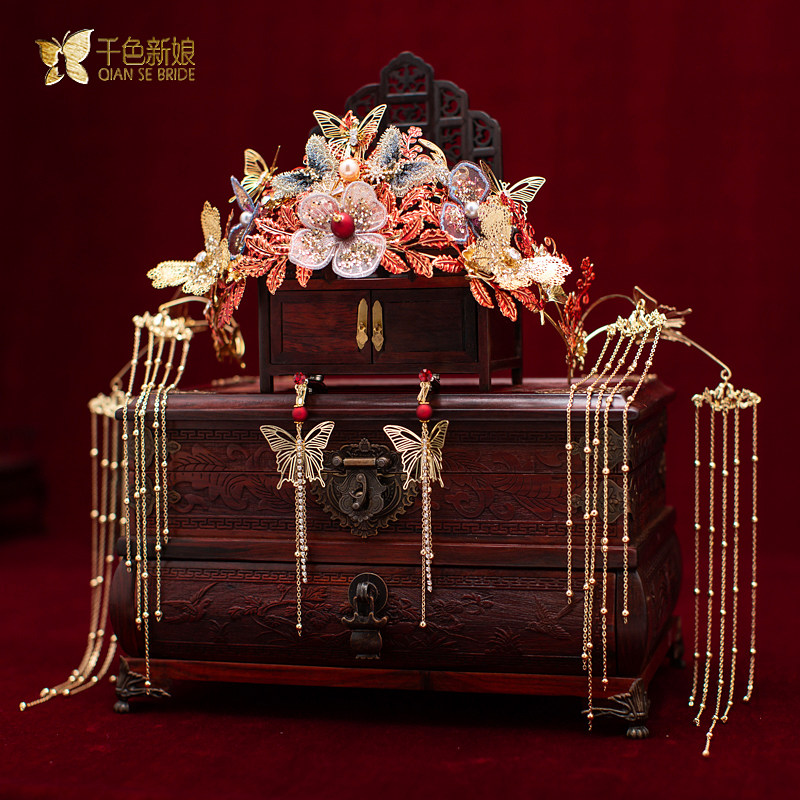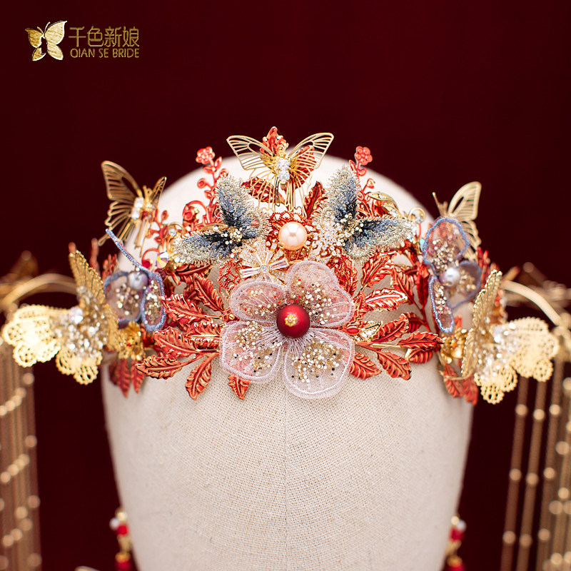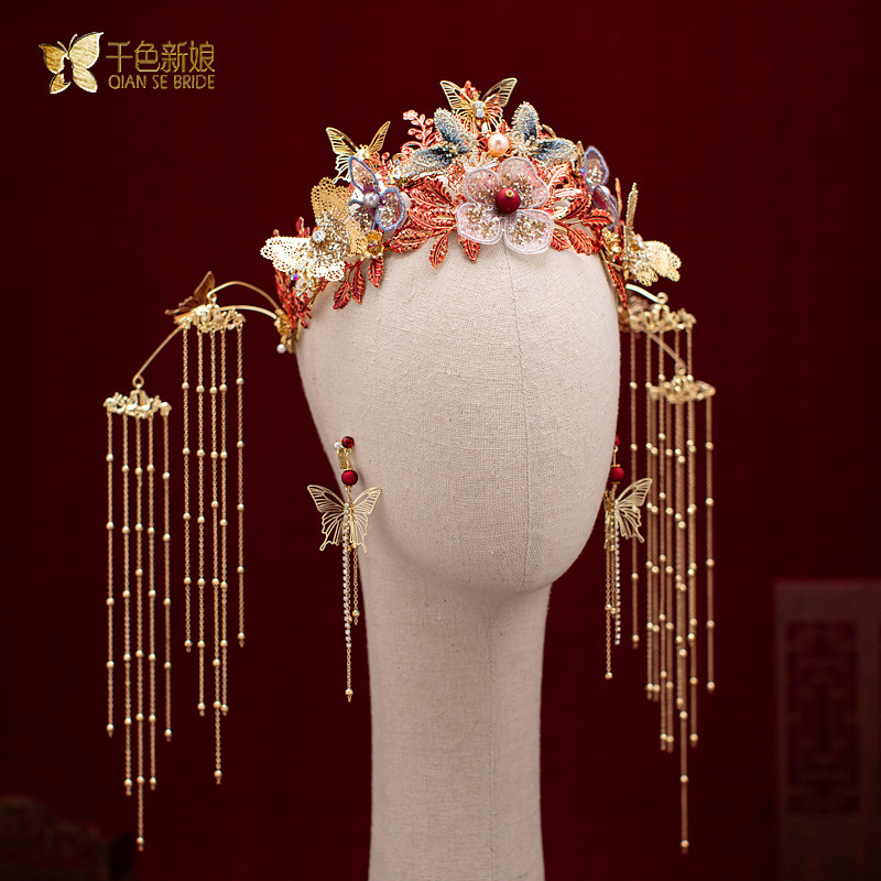 Bridal Headwear Chinese Crested Chengguan Wedding Ancient Dress Hair Accessories Red Suit Show and Dragon Pineapple hanging streaming Su accessories Hongying