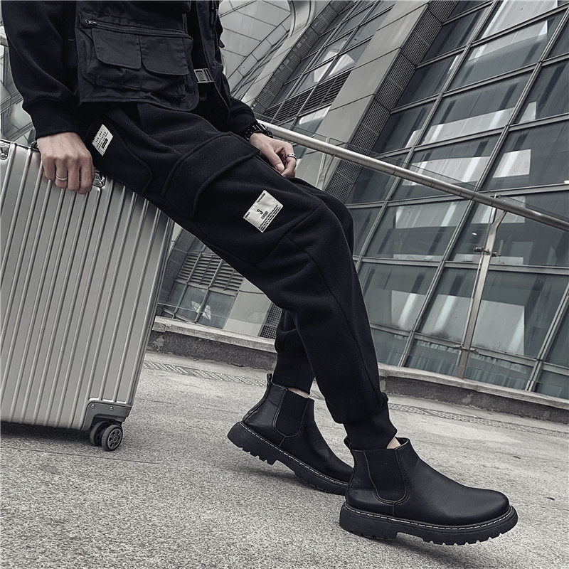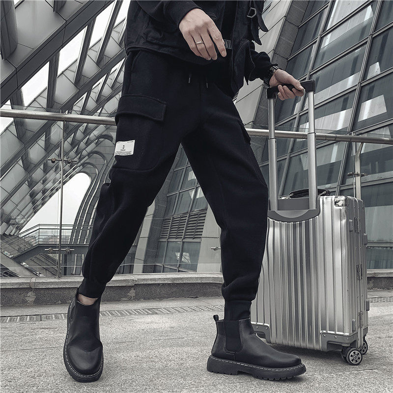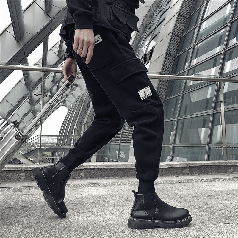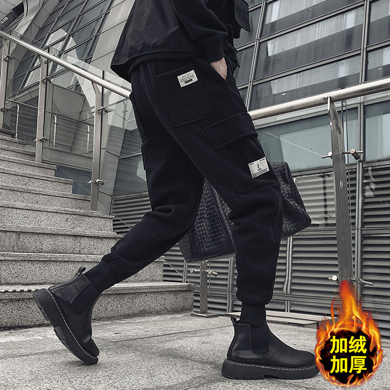 Dark plus velvet padded overalls men's autumn and winter trends Joker card black bunches casual knitted trousers