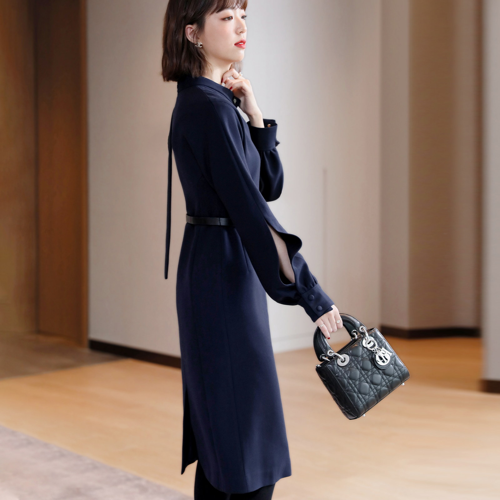 Elegant 100 hitch a fork lantern sleeve Ocean dress 2022 Fall new temperament commute cashew slim middle long dress