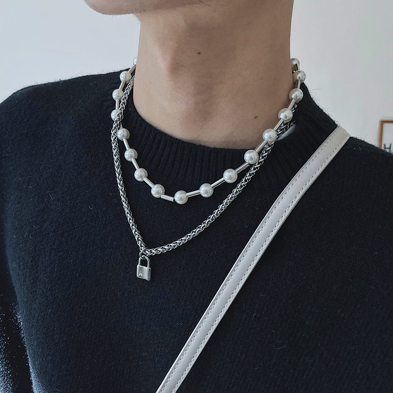 Shop Owner Self Leave Fake Two Combinations Ins Lock Bone Necklace Male Pearl Titanium Steel Small Crowdclass Superior Sensation Pendant Male Ornament