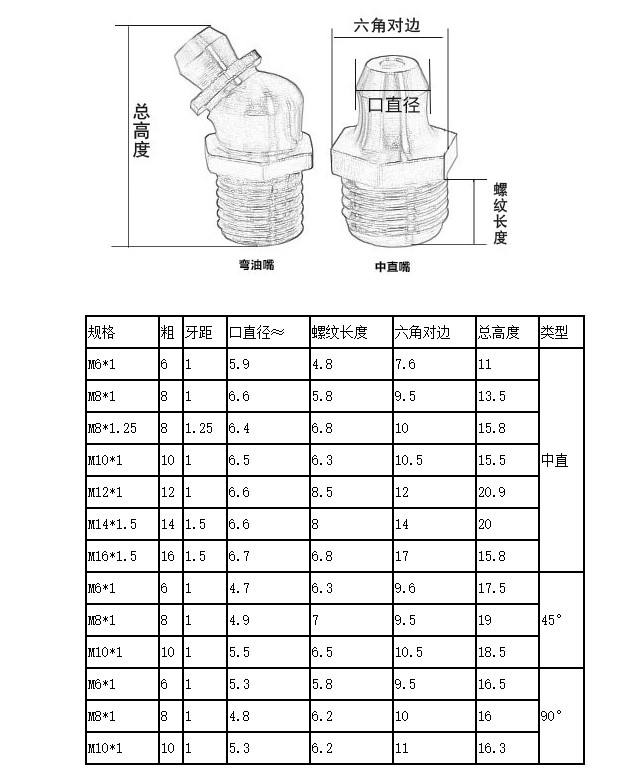 M10 * 1 fine tooth (national standard common) G 1 8-28 teeth (strange hand commonly used) straight ZG 1 8-28 teeth (Ying made cone pipe) with taper M8 * 1 fine tooth M6 *