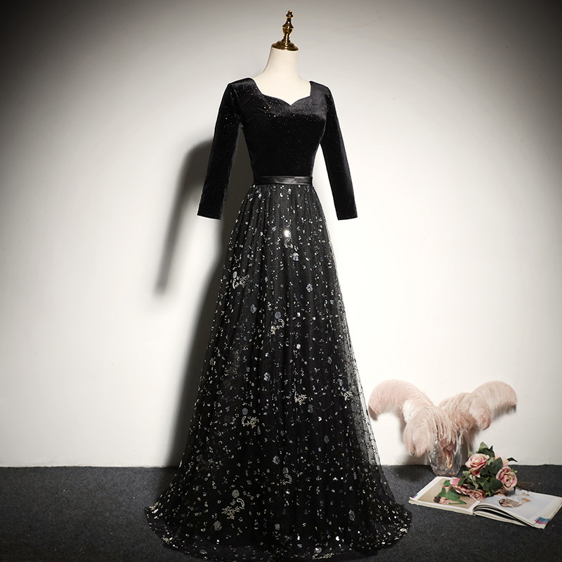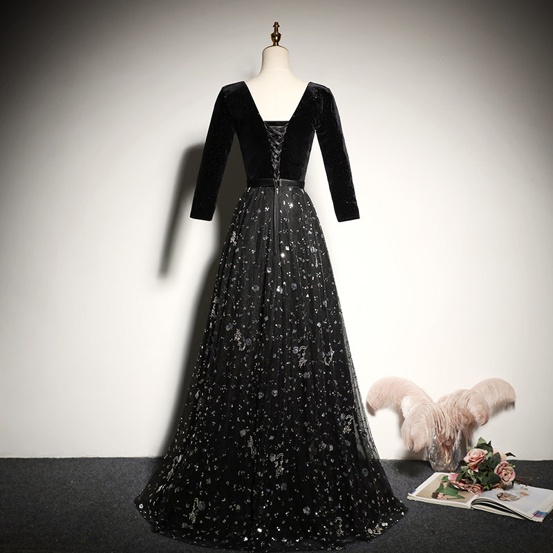 Black evening dress 2022 new banquet noble elegant long edition host of the veneer long - sleeve female