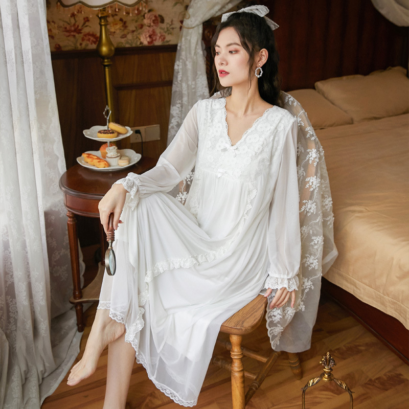 Very fairy white style pyjamas woman spring and summer new modeir lace palace windy overlong princess sleeping dress thin summer