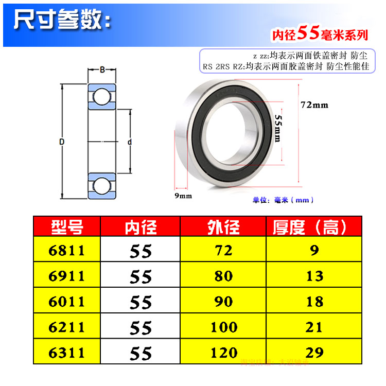 6811ZZ (55*72*9mm)6811RS (55*72*9mm)6911ZZ(55*80*13mm)6911RS