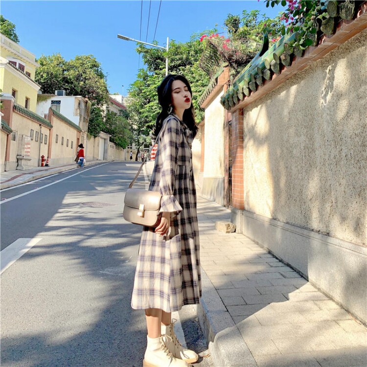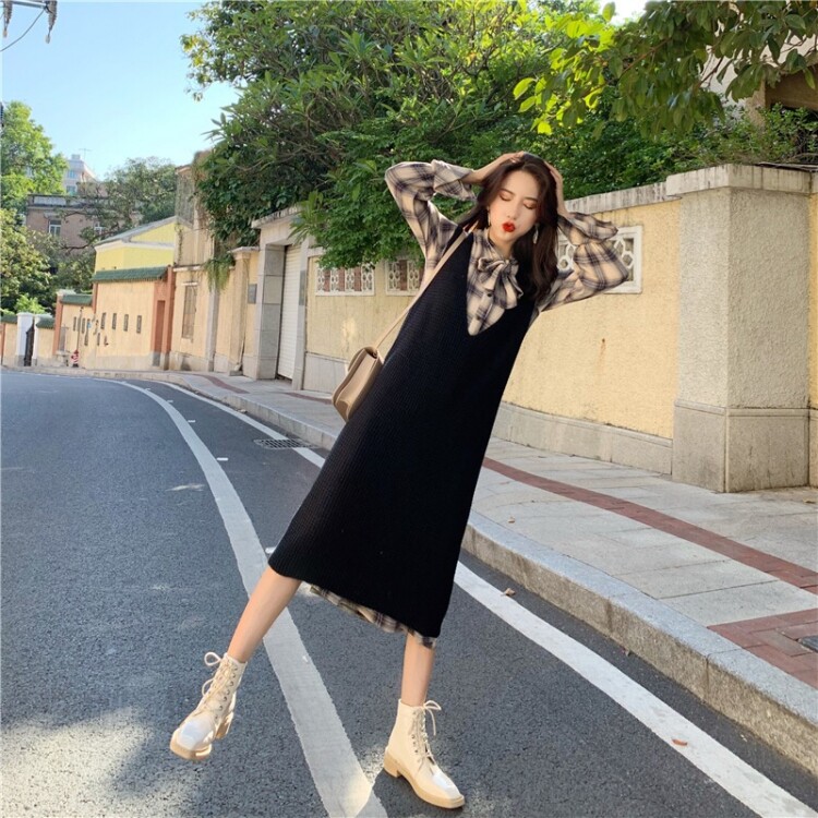 Large size women's clothing 2021 early spring new all-match inner dress, fat mm, loose, cover the belly and show thin plaid skirt suit
