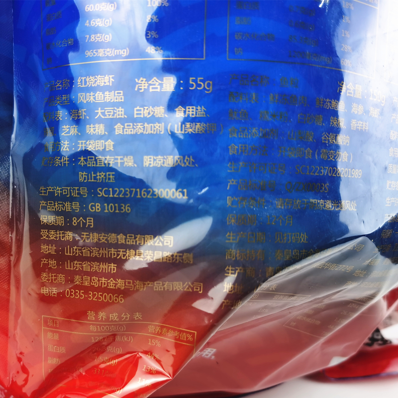 Shredded squid, crab, shrimp slices, jellyfish, edible salt, sugar, drinking water, etc. See packaging
