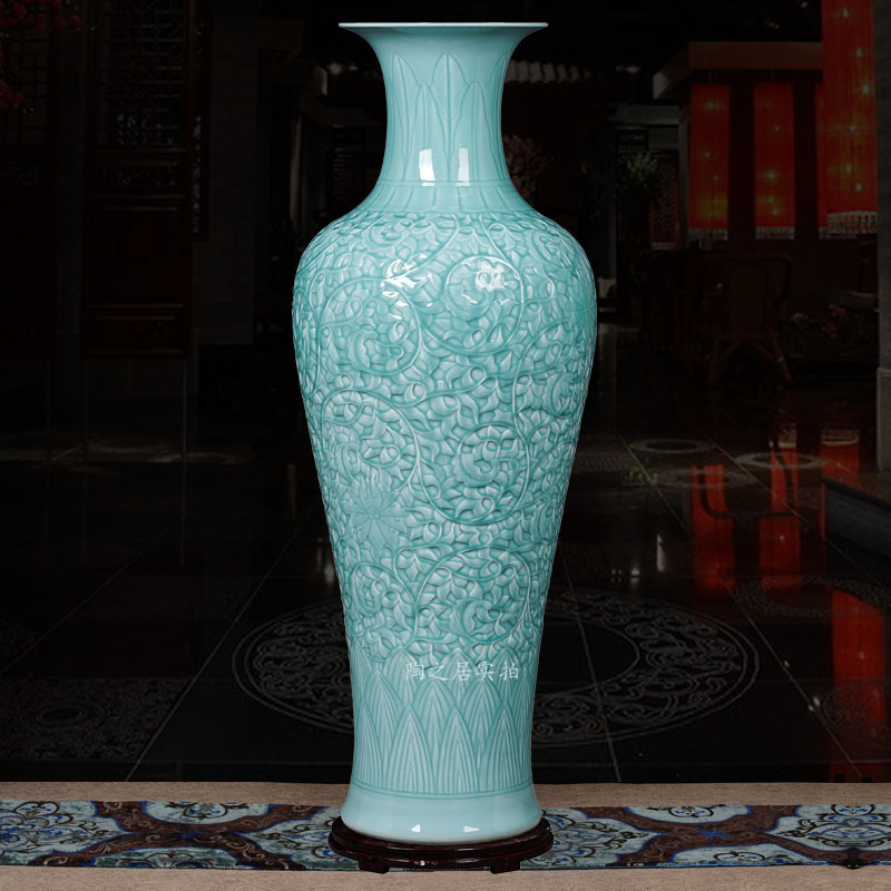Jingdezhen ceramic large vase high-end hand-carved celadon peony lotus living room hotel floor large ornament