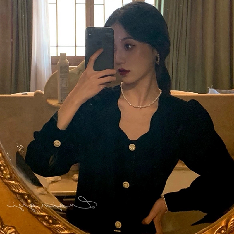 Black Hong Kong flavor retro chic waist art high-end first love tea break pear-shaped body pure light ripe sweet little man summer dress matching