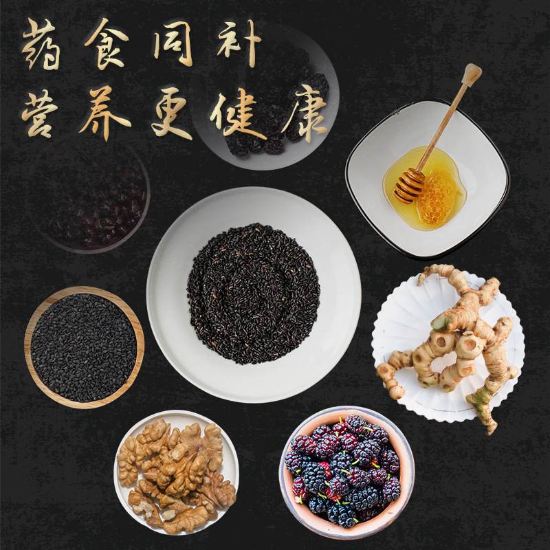 Black sesame, black beans, black rice, honey, mulberries, walnuts, black dates, yellow essence