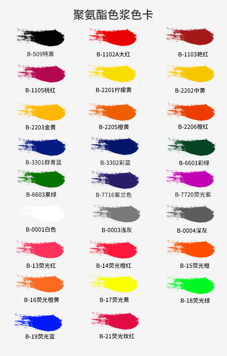 Extra Black B-509 White B-0001 Big Red B-1102A Bright Red B-1103 Peach B-1105 Lemon Yellow B-2201 Medium Yellow B-2202 Golden B-2203 Orange Yellow B-2205 Color Blue B-3302 Color Green B-6601 Fruit Green B-6603 Fluorescent Purple B-7720 Light Gray B-0003 Fluorescent Red B-13 Fluorescent Orange Red B-14 Fluorescent Orange B-15 Fluorescent Orange Yellow B-16 Fluorescent Yellow B-17 Fluorescent Green B-18 Fluorescent Blue B-19