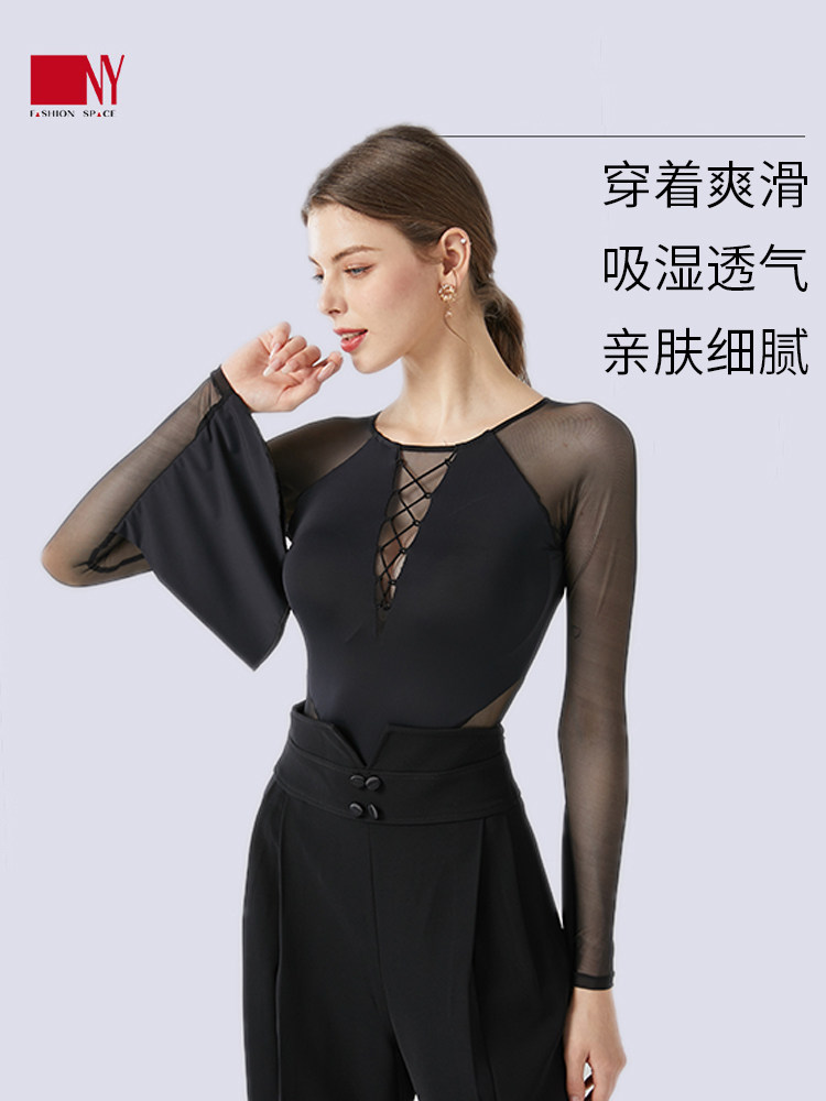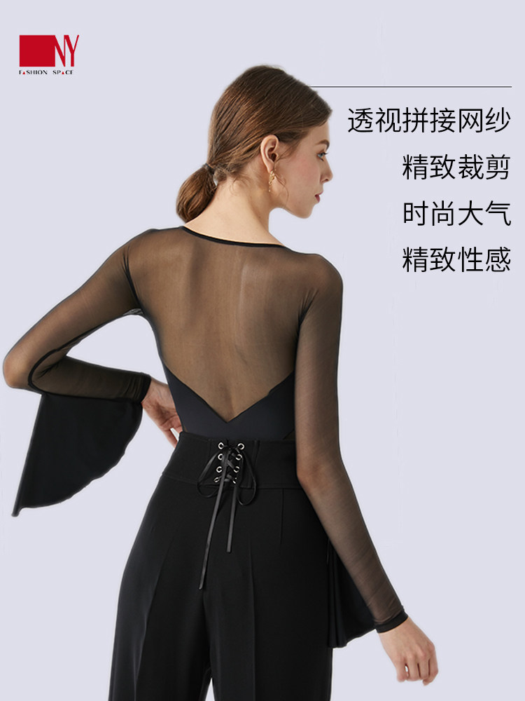 Nayi NY modern dance top women's long-sleeved national standard dance adult Latin dance mesh gauze floating sleeve stitching one-piece practice clothes