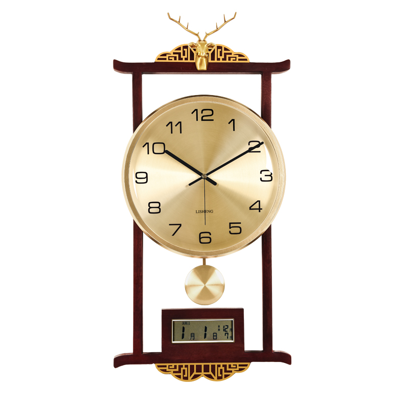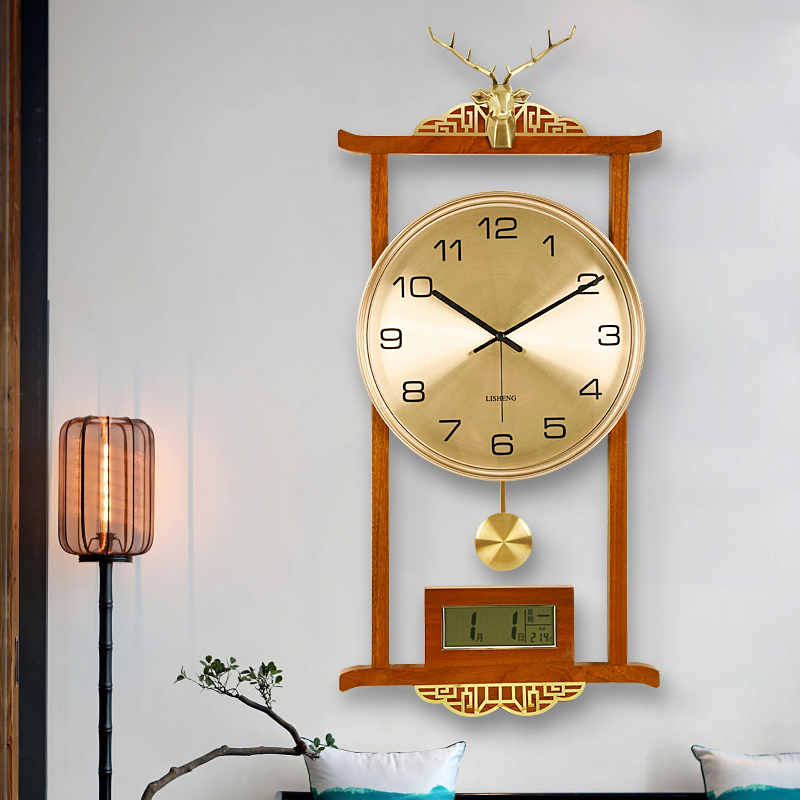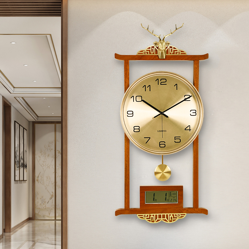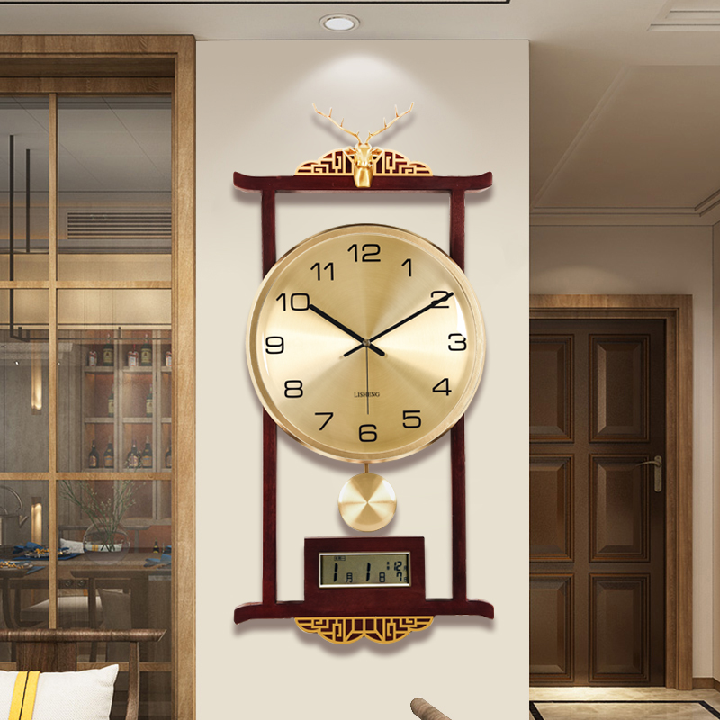 New Chinese style solid wood wall clock deer head quartz clock living room atmosphere household fashion Chinese wind perpetual calendar electronic clock