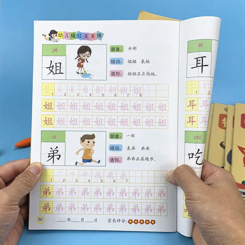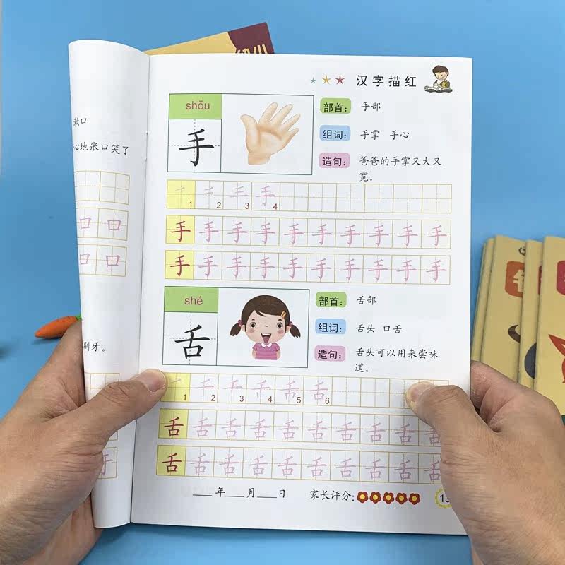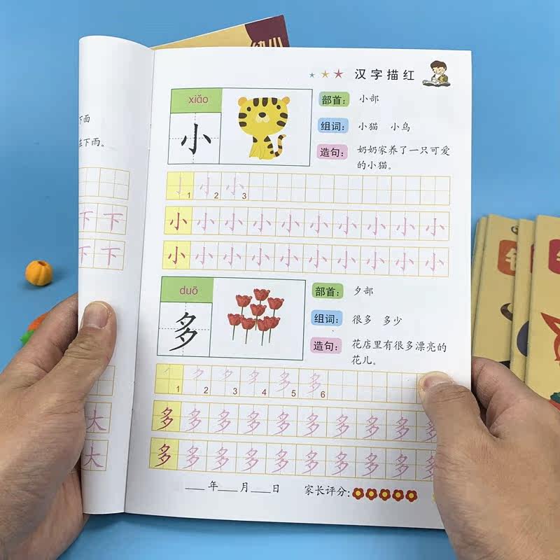 Chinese characters draw red practice posts Stroke Pinyin radicals Practice every day for young children to connect with the first grade of the first grade Copy practice book