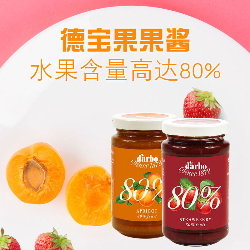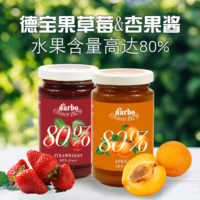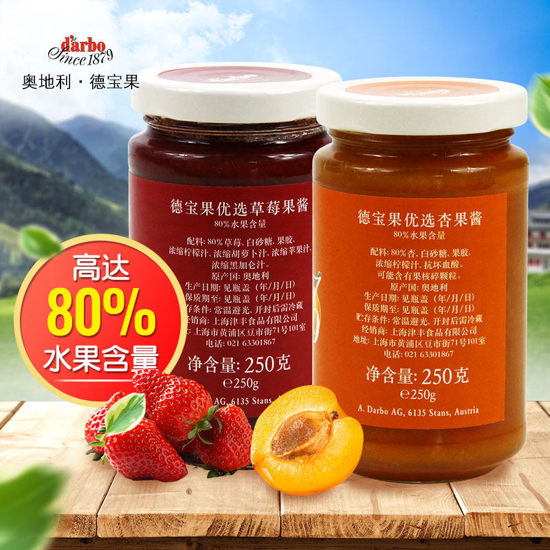 (Imported) Austrian Debao jam strawberry 250g plus apricot 250g pulp content of 80% pulp can be seen