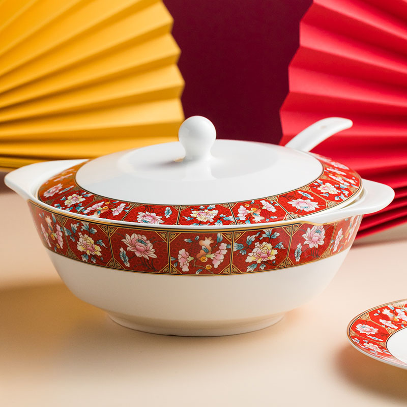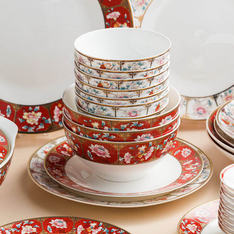 Pine Hair 48 Head Jin embroidered home Bone Porcelain Bowl tray Chinese Wind Festive Suit Cutlery WEDDING CUTLERY WEDDING PALACE RICE BOWLS