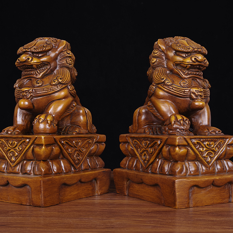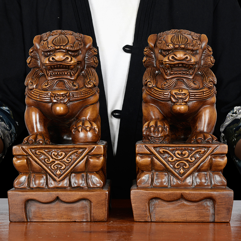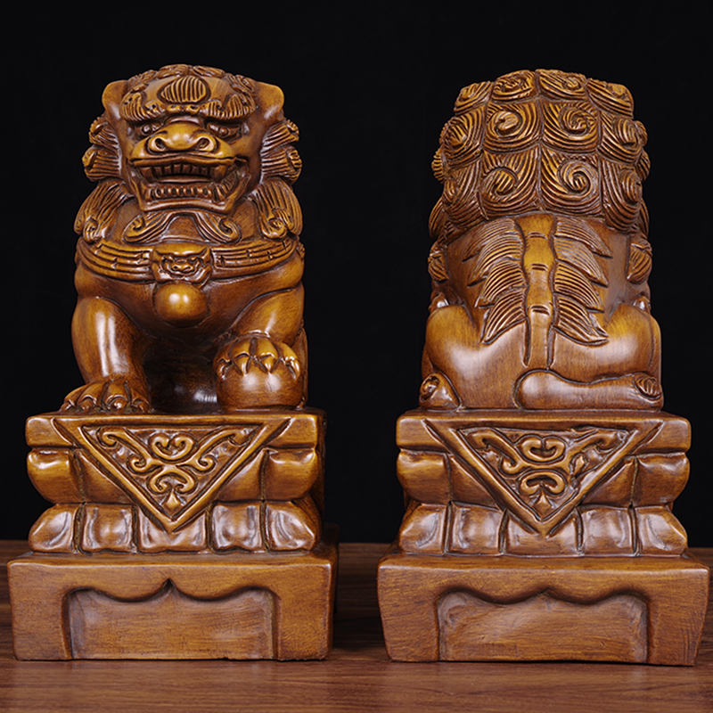 Solid wood lion ornaments lucky town house Chinese style antique auspicious animal living room porch office Fengshui woodcarving decorations