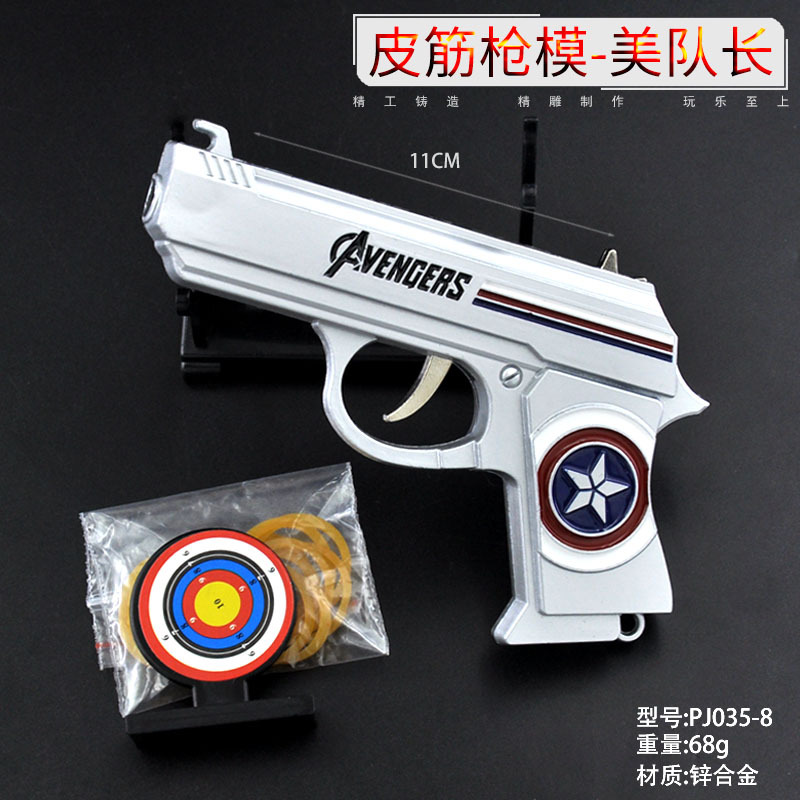 Captain America (Silver) 1 Pack of Rubber Bands 1 Target Batman (Black) 1 Pack of Rubber Bands 1 Target Straw Hat Head (Grey) 1 Pack of Rubber Bands 1 Target Spider-Man (Grey) 1 Pack of Rubber Bands 1