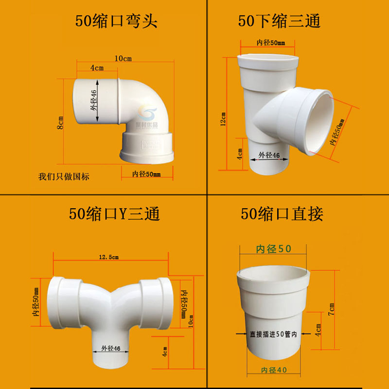 50 bunches elbow 50 bunches direct 50 lower shrink tee 50 variable 40 Size head 50 bunches mouth Y shaped tee 75 bunches mouth 75 bunches direct 75 lower shrink tee 110 beamport elbow 1