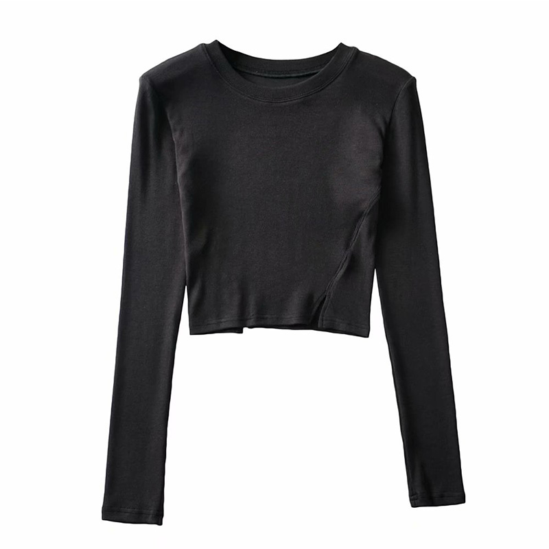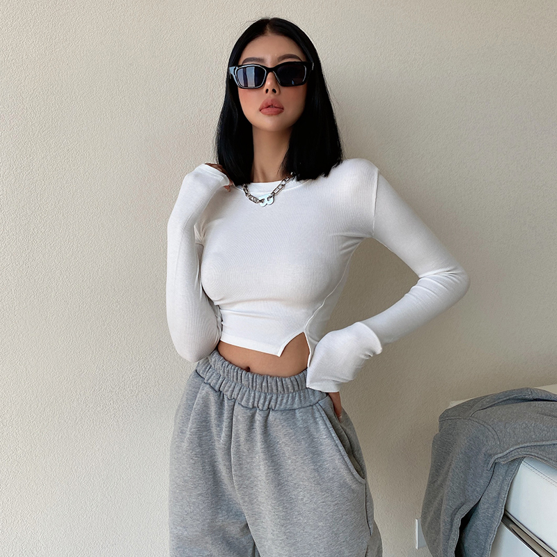 liviahome careful machine front and rear split solid color base T-shirt female European and American style sexy umbilical slim top