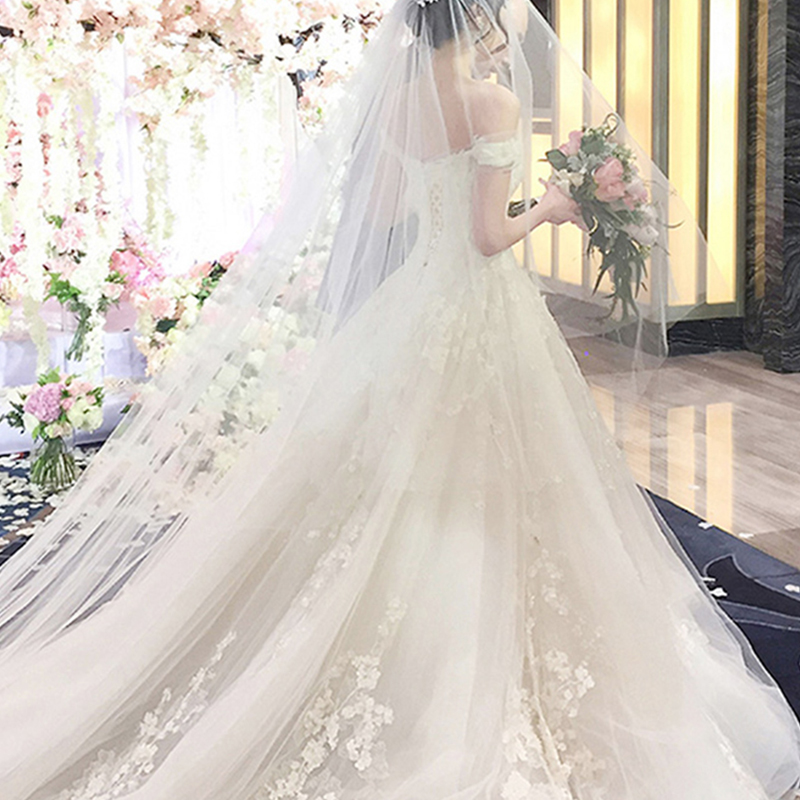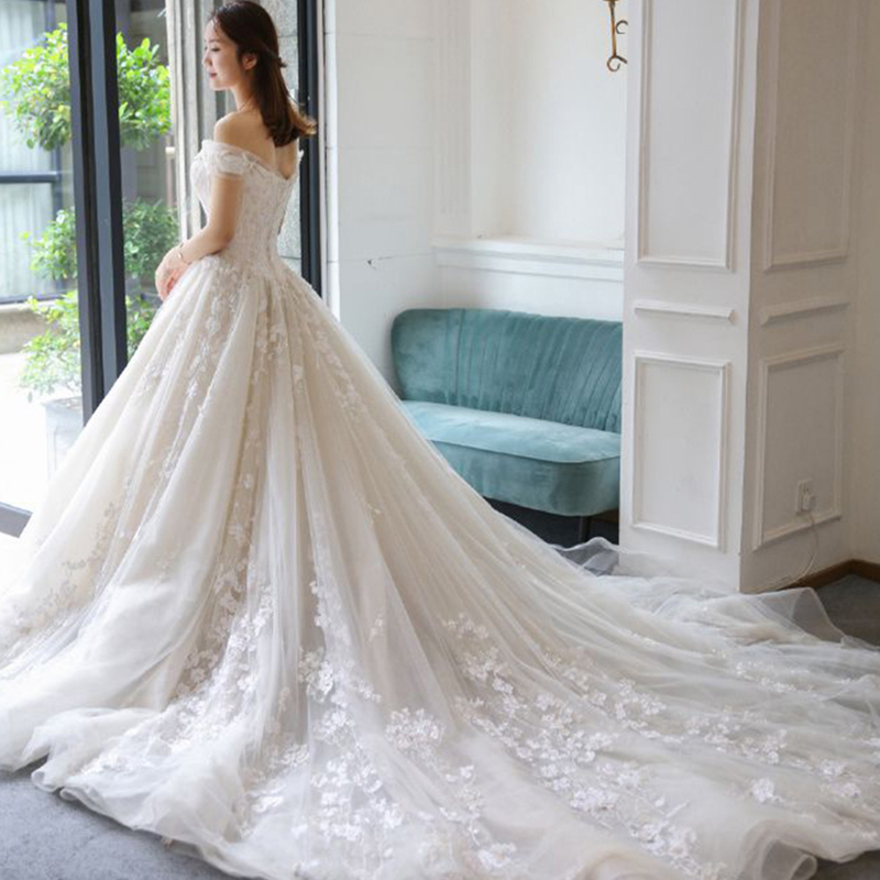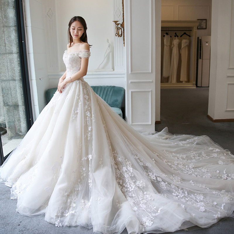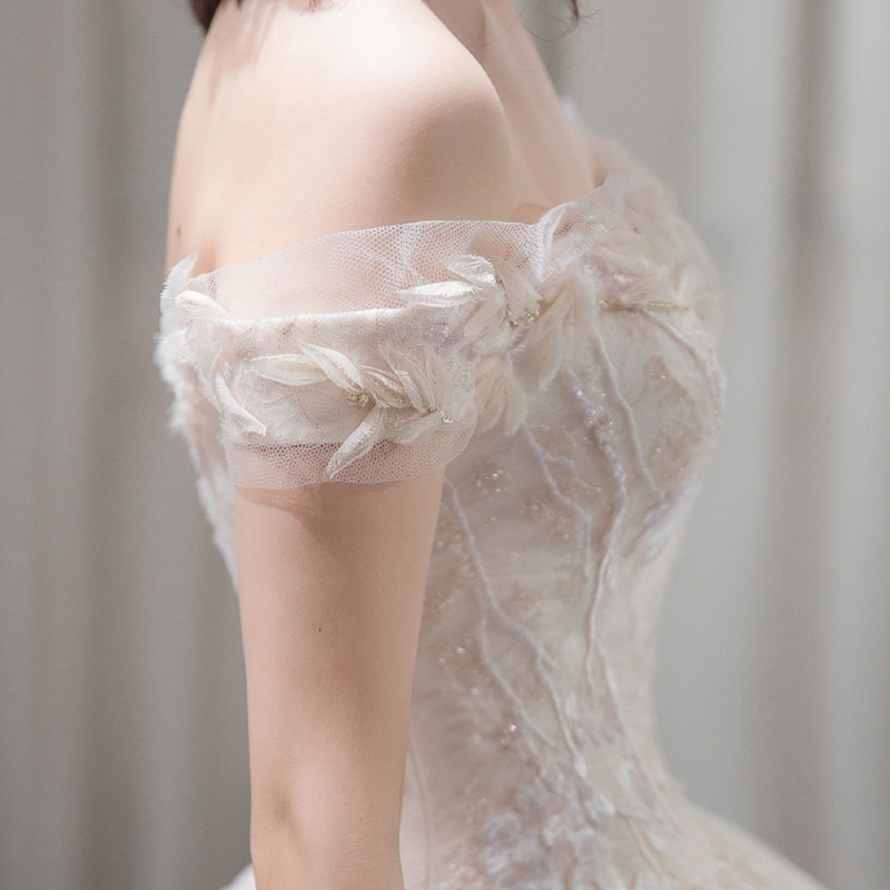 A word shoulder wedding dress 2023 new drag - tail little bride Sen Fantastic Fall Fall Winter Princess dress