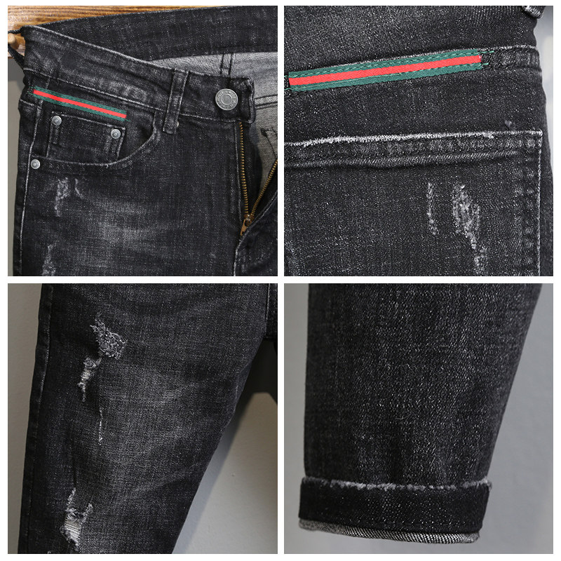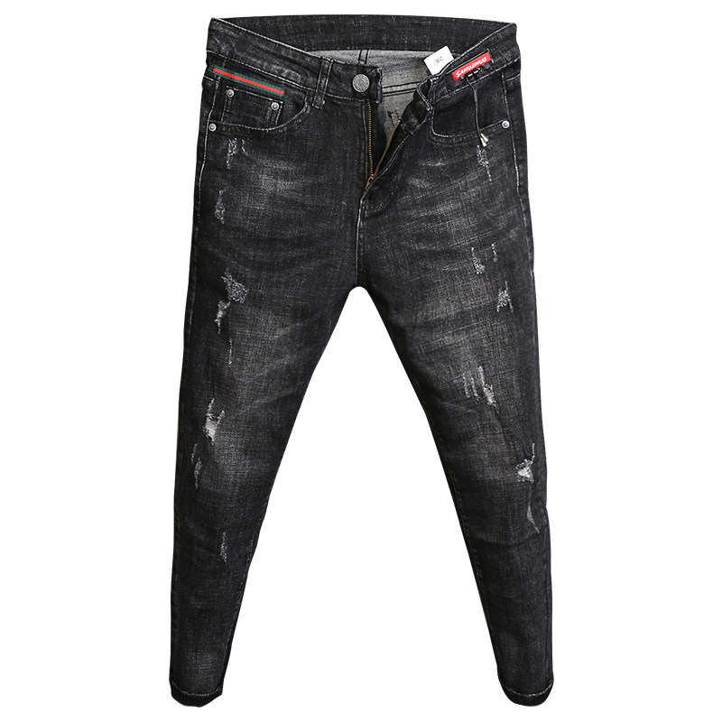 2022 Spring Frayed Trendy Black Men's Jeans Korean Style Slim Small Feet Versatile Thickened Warm Trousers