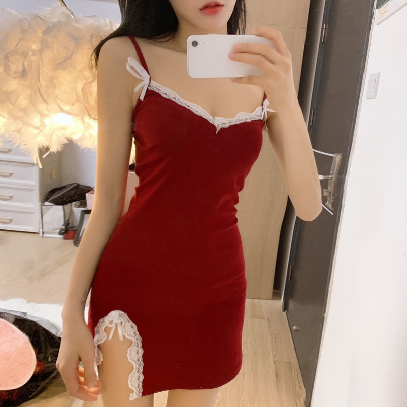 Ultra Short Skirt Walking Light After to Spice Clothes Live Low Chest Nightclub Sexy Lace Dress V Collar Bottom