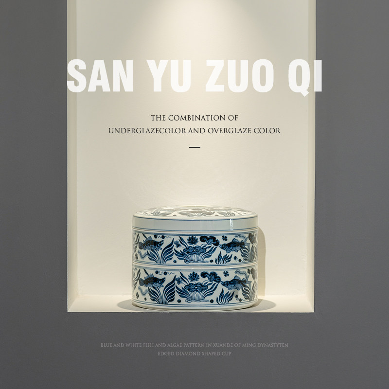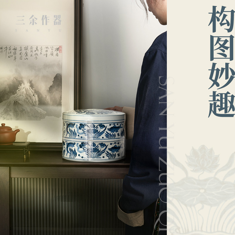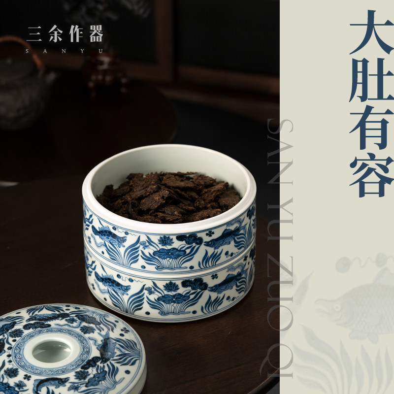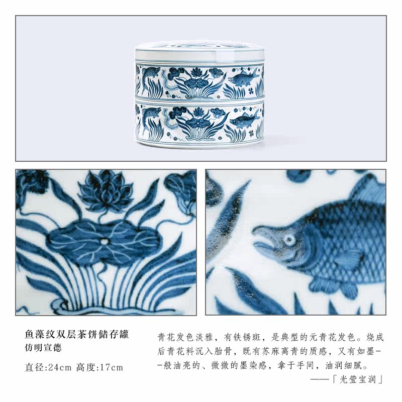 more than three Lingo imitation Ming Xuande green flower fish algae grain double layer tea cake storage tank Jingdezhen pure handmade