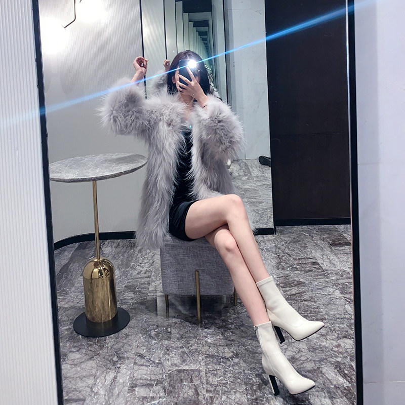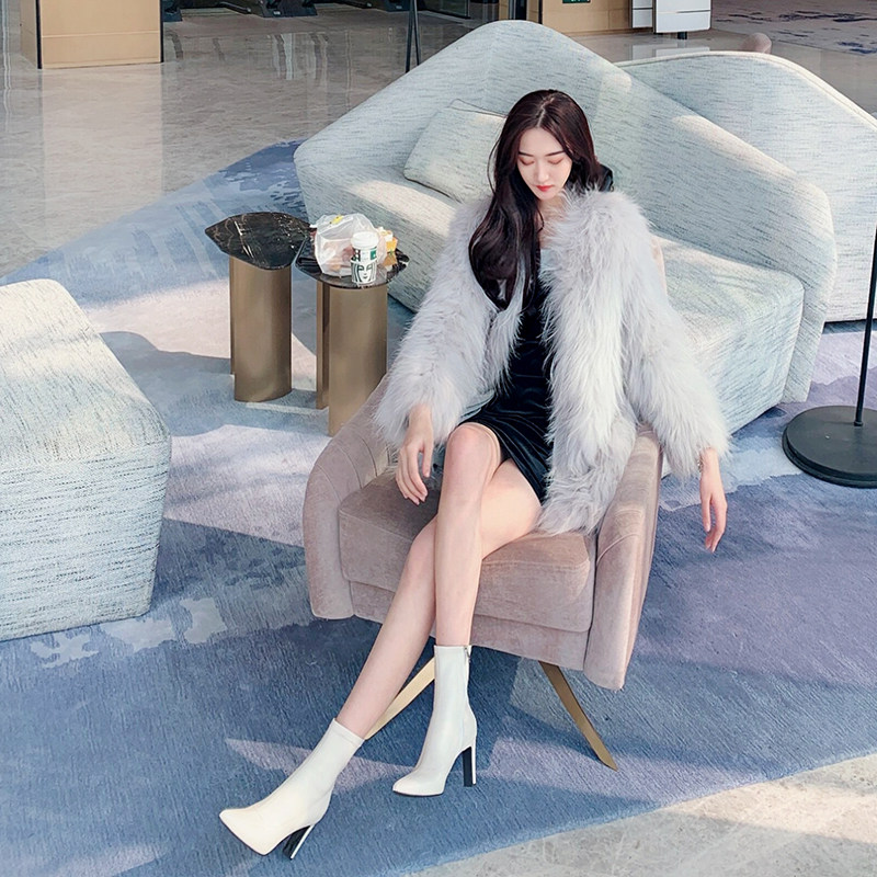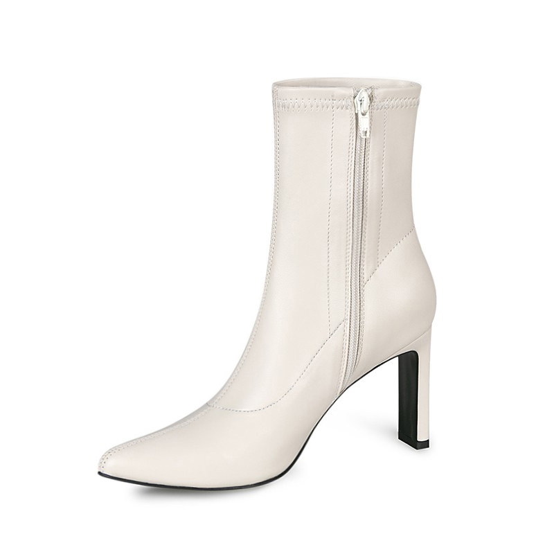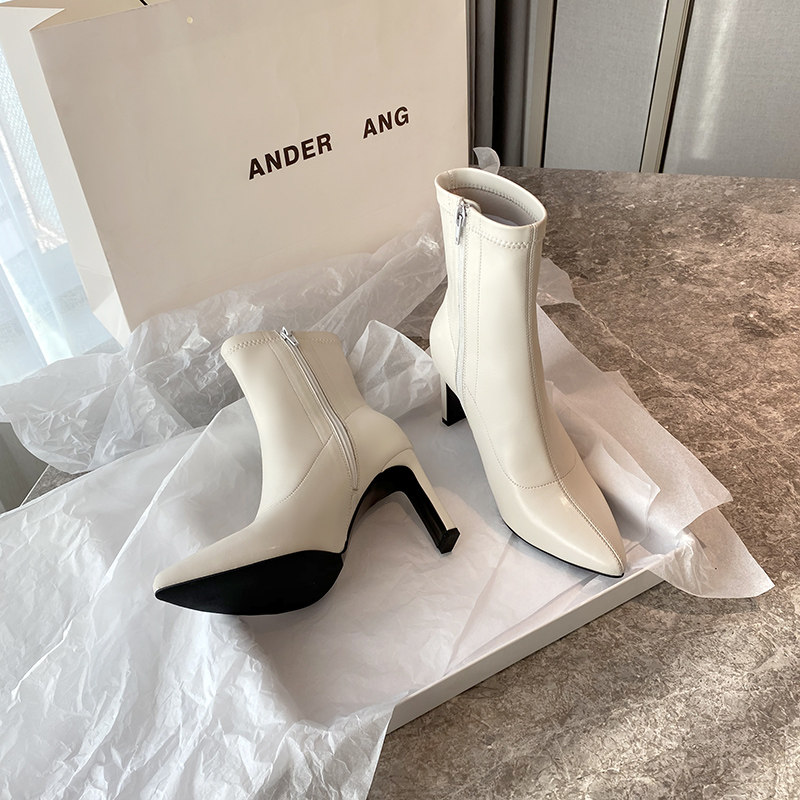 White boots women's 2022 new autumn and winter pointed toe high heels thick heel rice white explosion style elastic thin short boots