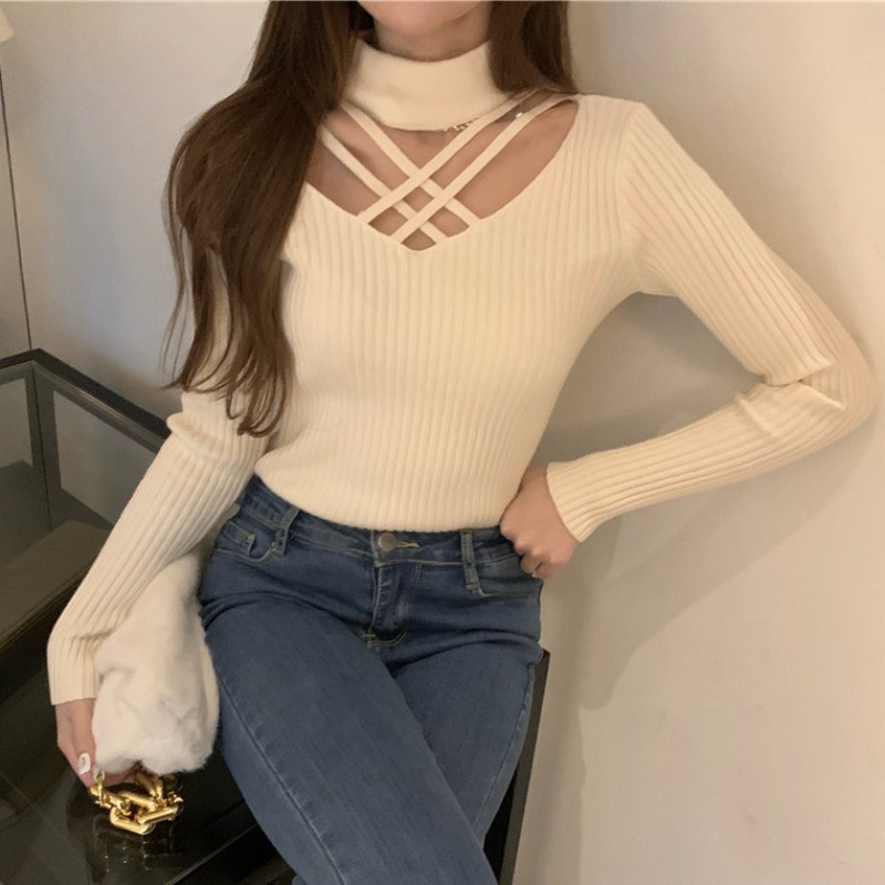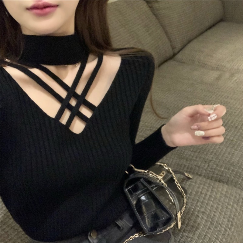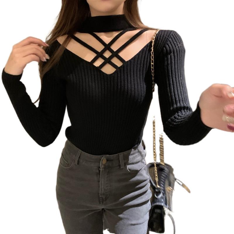 Sanskrit slats undershirt female spring sexy hollowed-out 100 hitch black tight long sleeves to build up a knitted blouse