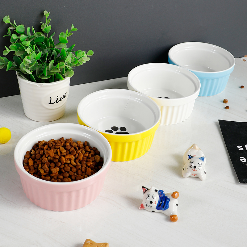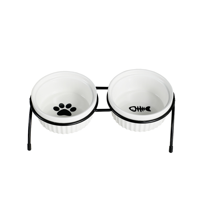 white paw print bowl white fishbone bowl black circle stand pink paw print bowl pink fishbone bowl black circle stand blue paw print bowl blue fishbone bowl black circle stand yellow paw print bowl yellow fish