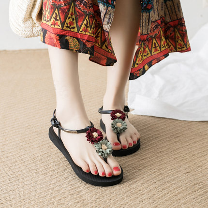 Special Cabinet New Flowers Sandals Women Summer Flat Heel Bohemian Ethnic Wind Flat Bottom 100 Hitch Holiday Seaside Beach Shoes