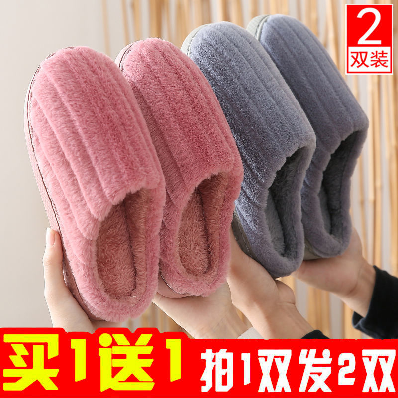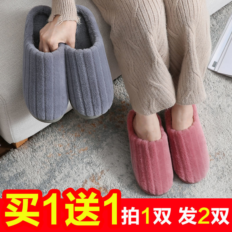 Buy one send a cotton slippers female winter home bag heel couple indoor thick bottom anti-slip and warm moon fur slippers male