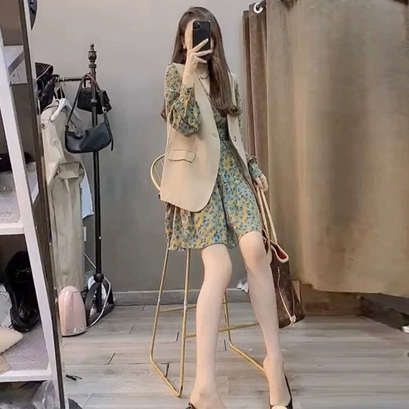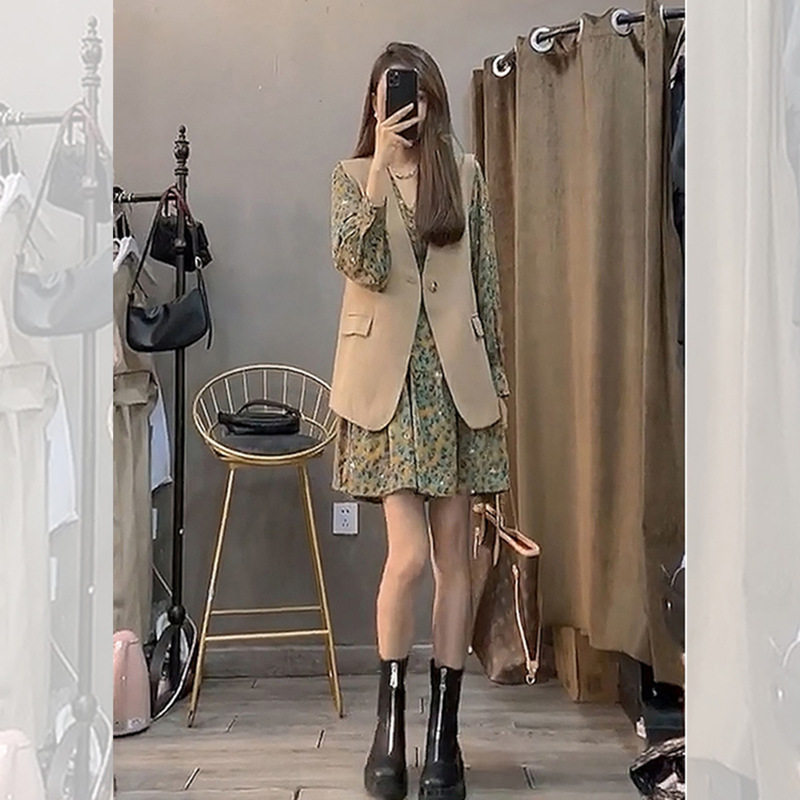 Tea break French design sense niche light luxury fried street long-sleeved floral dress vest two-piece suit women's spring and autumn