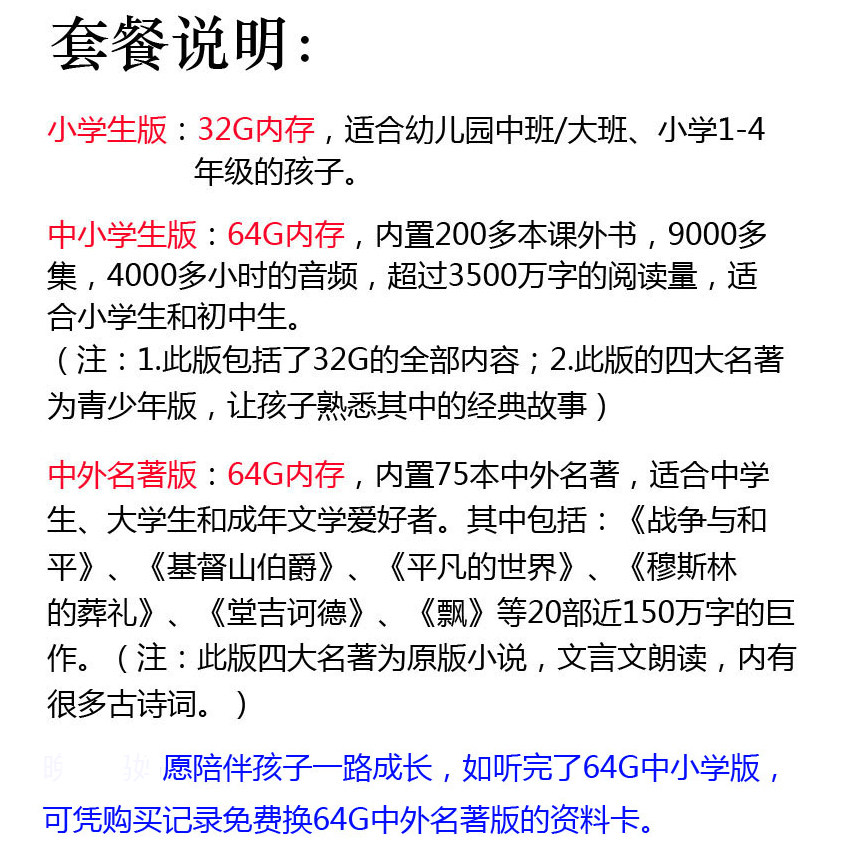 Upgraded edition 32G primary school student version (red) upgraded version 32G primary school student version (white) upgraded version 32G primary school student version (blue) upgrade version 64G primary and secondary school student version (red) upgrade version 64G primary and secondary school student version (white) upgrade version 64G primary and secondary school student version (blue) upgrade version 64G Chinese and foreign masterpiece version (white) upgraded version 64G Chinese and foreign famous books version (blue)