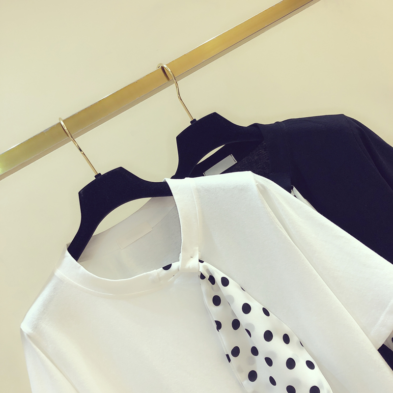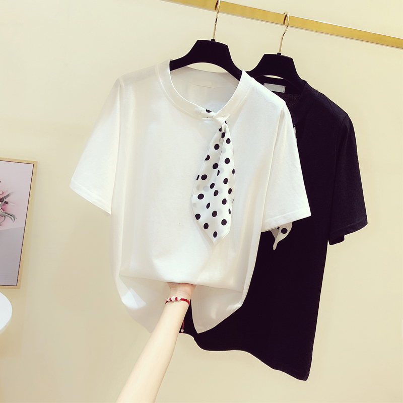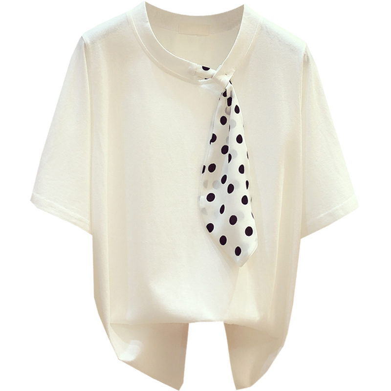 Tide Card Silk Scarf neckline T-shirt female short sleeve 2022 Summer new Korean version Loose Reduction Age Wave Point Pure Cotton Blouse