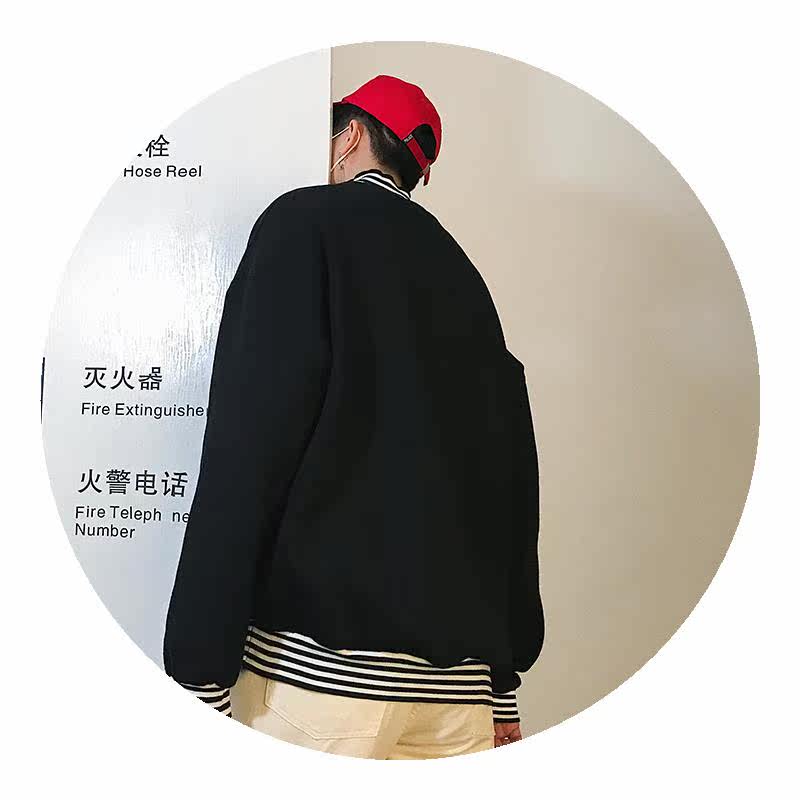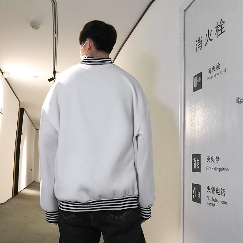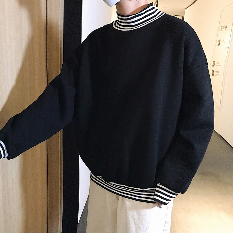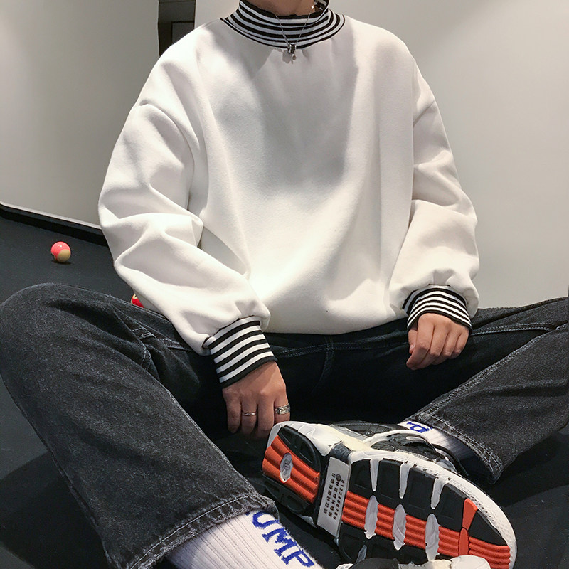Spring and autumn new Hong Kong style long-sleeved pullover striped round neck plus fleece sweater men's loose Korean version fake two-piece coat tide