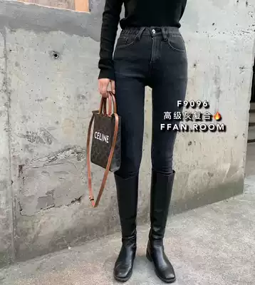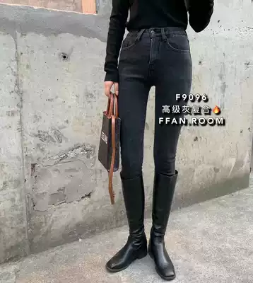 FFAN9096 plus velvet padded denim pipe pants women winter Korean version of high waist stretch thin nine points pencil pants boots
